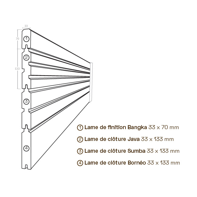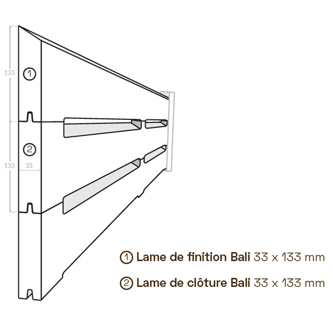 Lames en Bois du Nord, profilées sur les 2 faces et mixables entre elles pour une solution technique et esthétique.