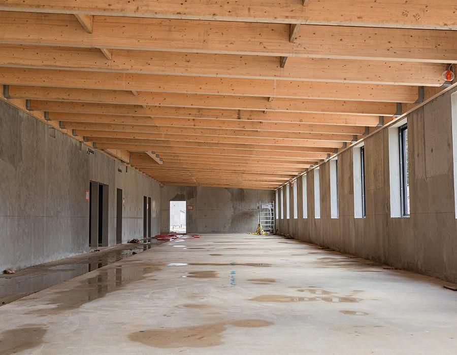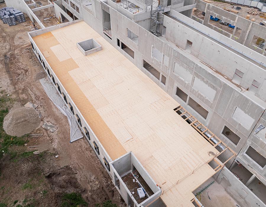Notre choix s’est porté sur les panneaux Kerto car ils pouvaient être aussi fabriqués en grande dimension tout en respectant l’optimisation demandée. Nous avons envoyé une liste de pièces numérotées par toiture et zonage nous permettant d’organiser dès le déchargement sur le chantier les zones de stockage. Par ailleurs, le panneau Kerto® L de 27 mm retenu respectait les prescriptions techniques demandées, à savoir un panneau formant « diaphragme » en toiture et support d’une étanchéité, recevant soit une toiture végétalisée soit des panneaux photovoltaïques.
