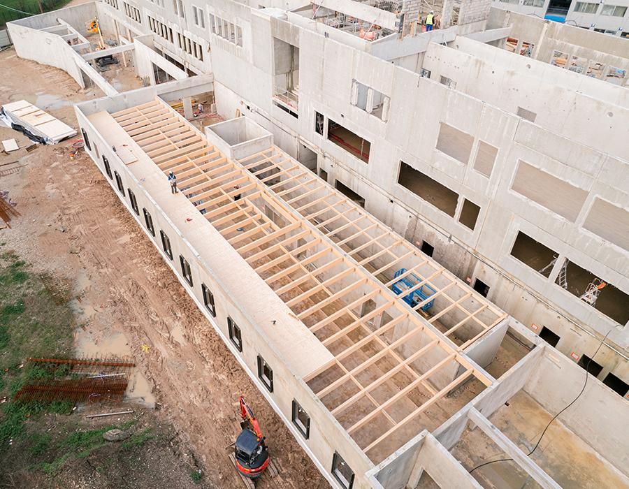 Le choix du LVL Kerto® s’est rapidement imposé à nous au moment des études d’exécution, en remplacement des panneaux OSB. Nous avions une surface très importante de panneaux à poser dans un planning serré et en période hivernale. Nous devions donc optimiser les durées de levage d’une part et respecter les délais en réduisant les temps d’utilisation de la grue à tour utilisée par le lot gros œuvre d’autre part. Nous avons posé 300 m² de panneaux quotidiennement !