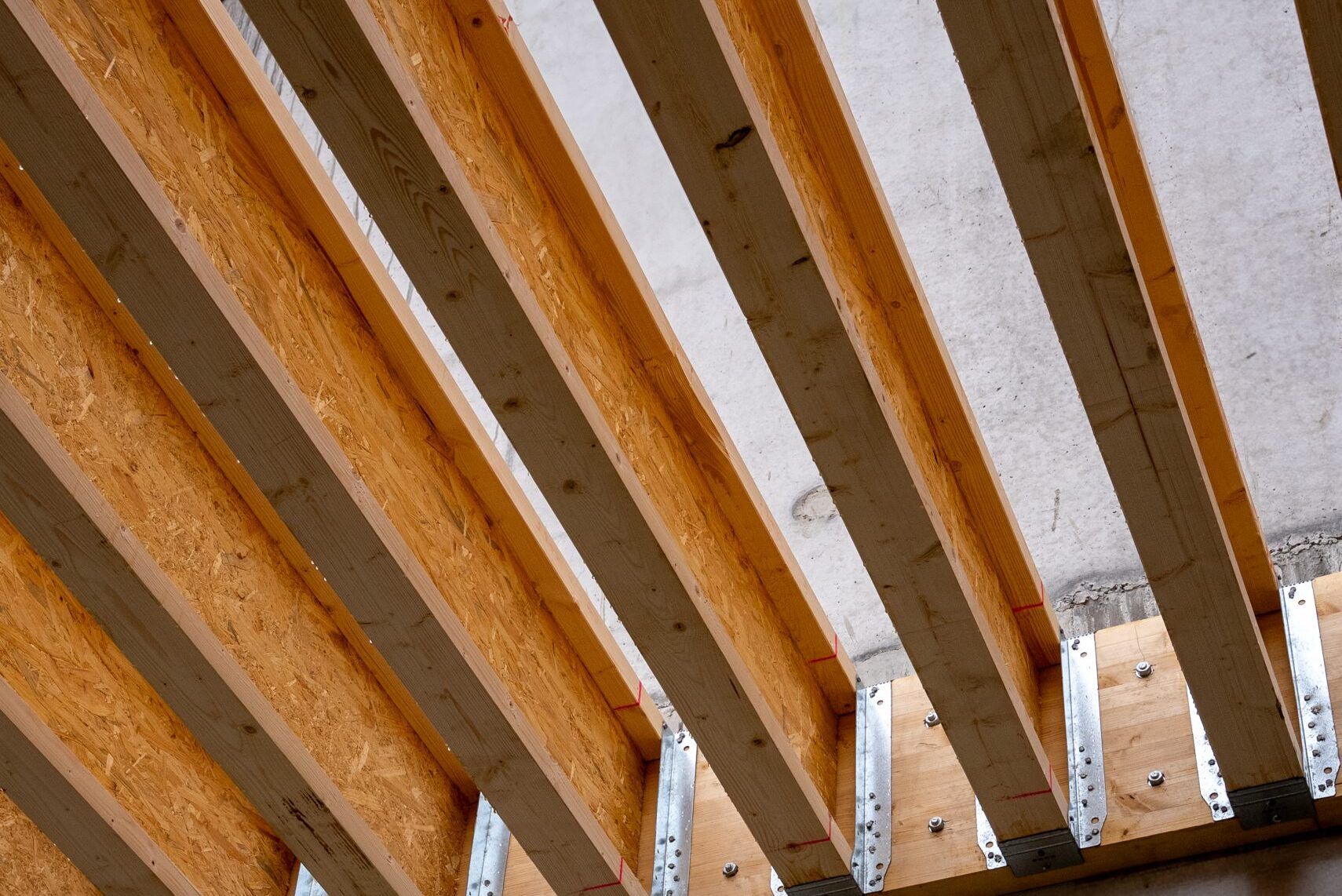 La résidence Pavillon Musical mise sur la mixité bois-béton-métal pour satisfaire ses ambitions environnementales. Au-dessus du socle et autour des noyaux de circulation en béton, l’ossature bois prend le relais sur le plan structurel. L’ensemble des planchers sont réalisés à partir de muralières en bois lamellé et d’un solivage en poutres en I, qui permet d’abriter une isolation renforcée. Surmonté d’un résilient acoustique et d’une chape, ce type de plancher offre également une grande efficacité phonique, notamment contre les bruits d’impacts.
