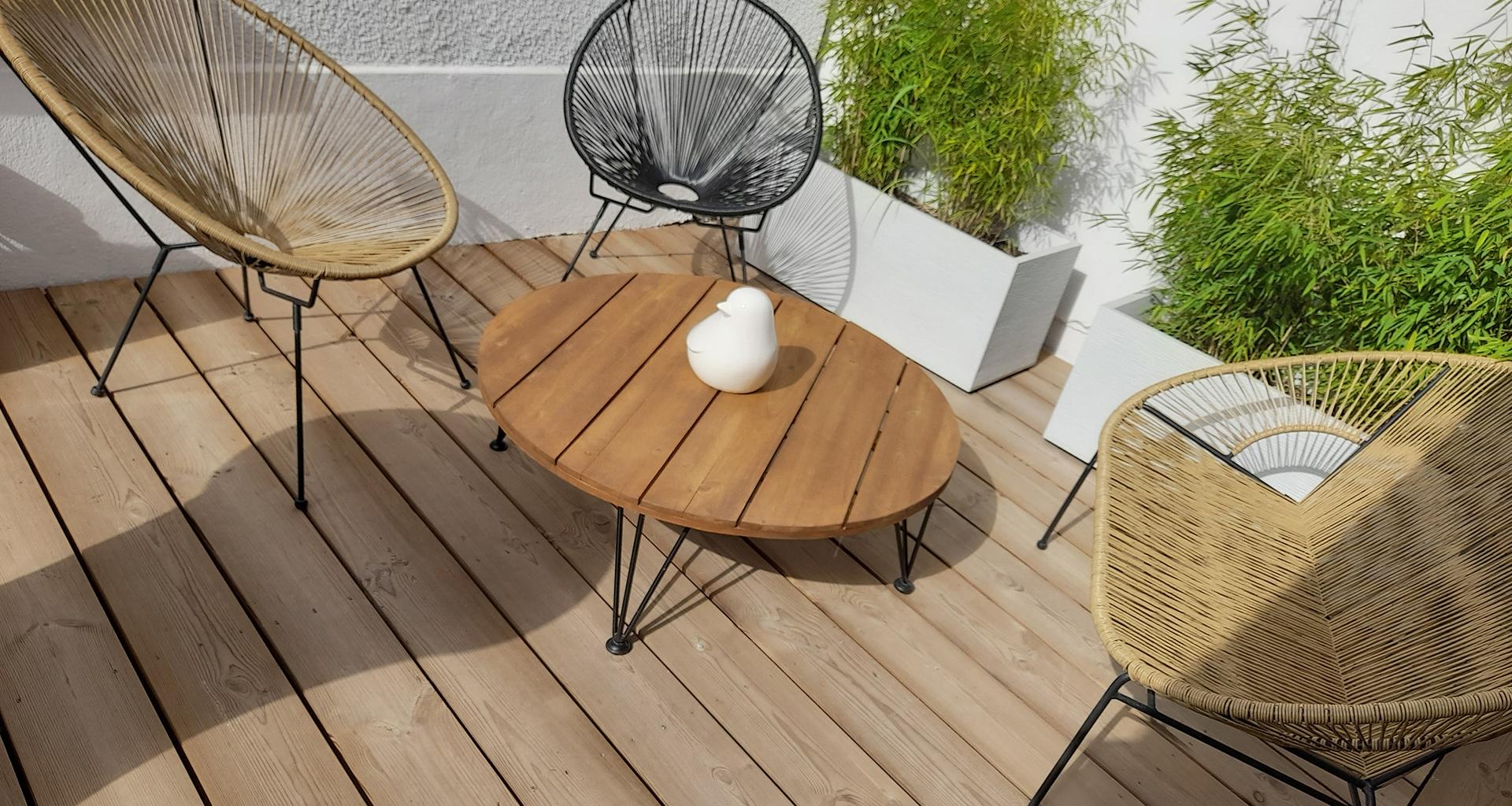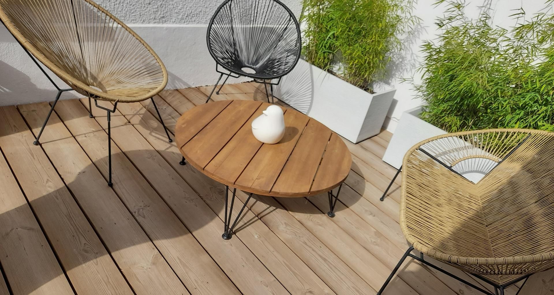 Situé au coeur de la maison, ce patio permet de facilement profiter de la lumière extérieure l’hiver et de se prélasser l’été sans vis-à-vis. L’alliance de ce bardage bois Protect Sapin du Nord et cette terrasse en Pin Rouge du Nord est un pari 100% bois réussit !