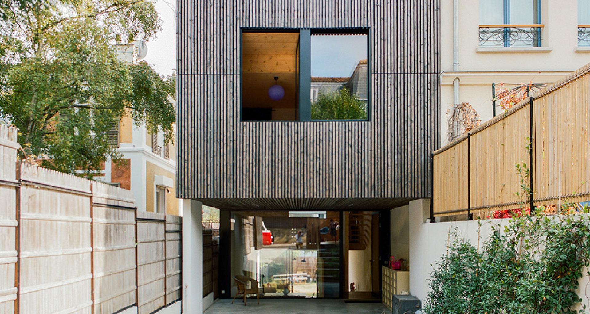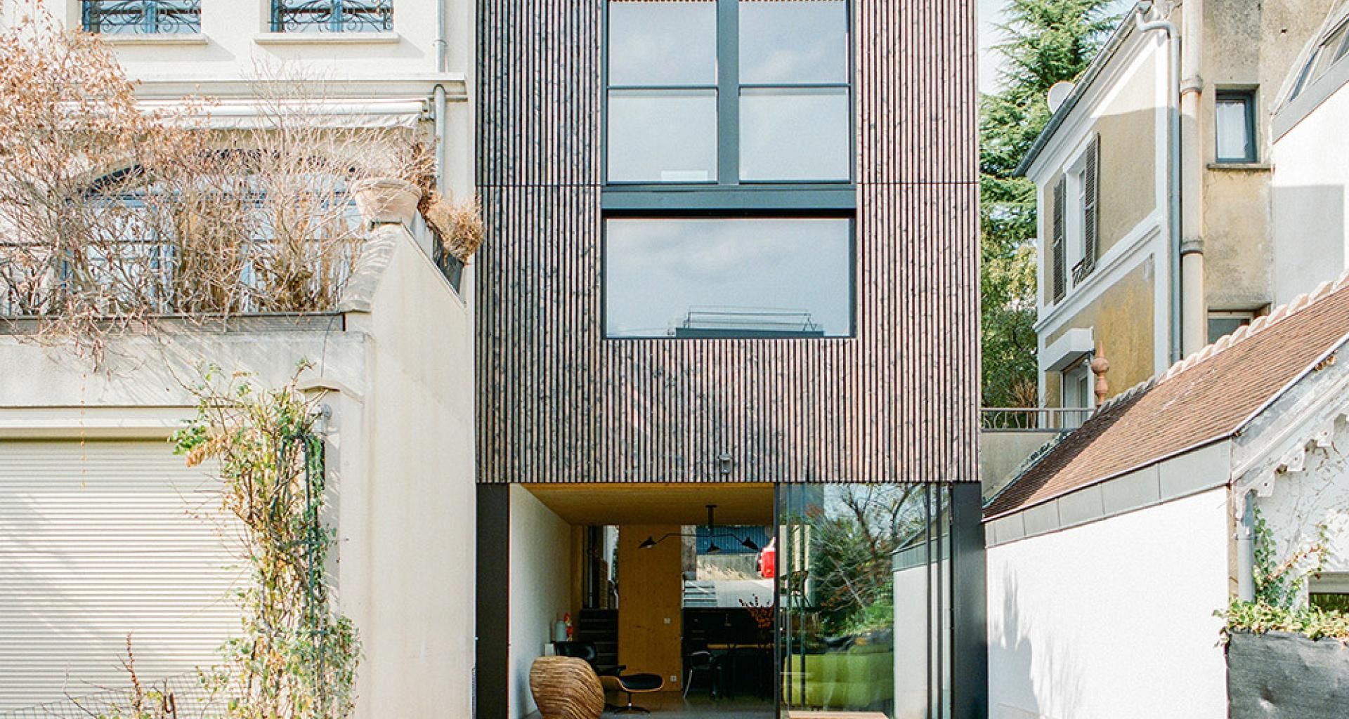 Sur un terrain conçu tout en longueur, cette maison familiale de 145 m² apparaît comme suspendue, en lévitation dans ce quartier de Sèvres (92). Entourée de bâtiments classiques, le bardage bois de cette maison citadine crée son caractère unique avec une façade rythmée et moderne.