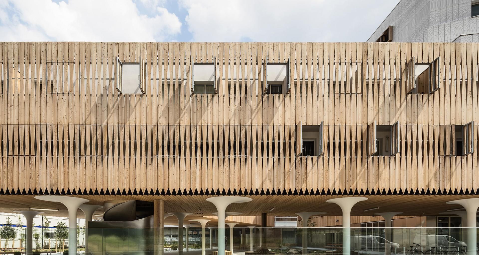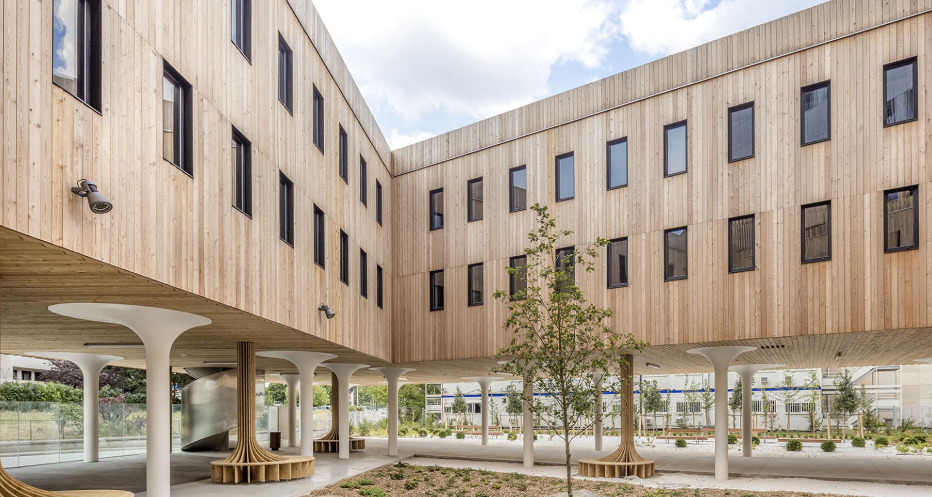 Ce magnifique ensemble abrite la résidence étudiante Simone Veil, située dans le 14ème arrondissement à Paris. En plein coeur de ville, une prouesse a été réalisée pour monter ce bâtiment avec pas moins de 4500 m² de vêture en Mélèze, totalement fabriquée sur-mesure (profil en joint creux, profil raboté 4 faces, lames fusibles).
