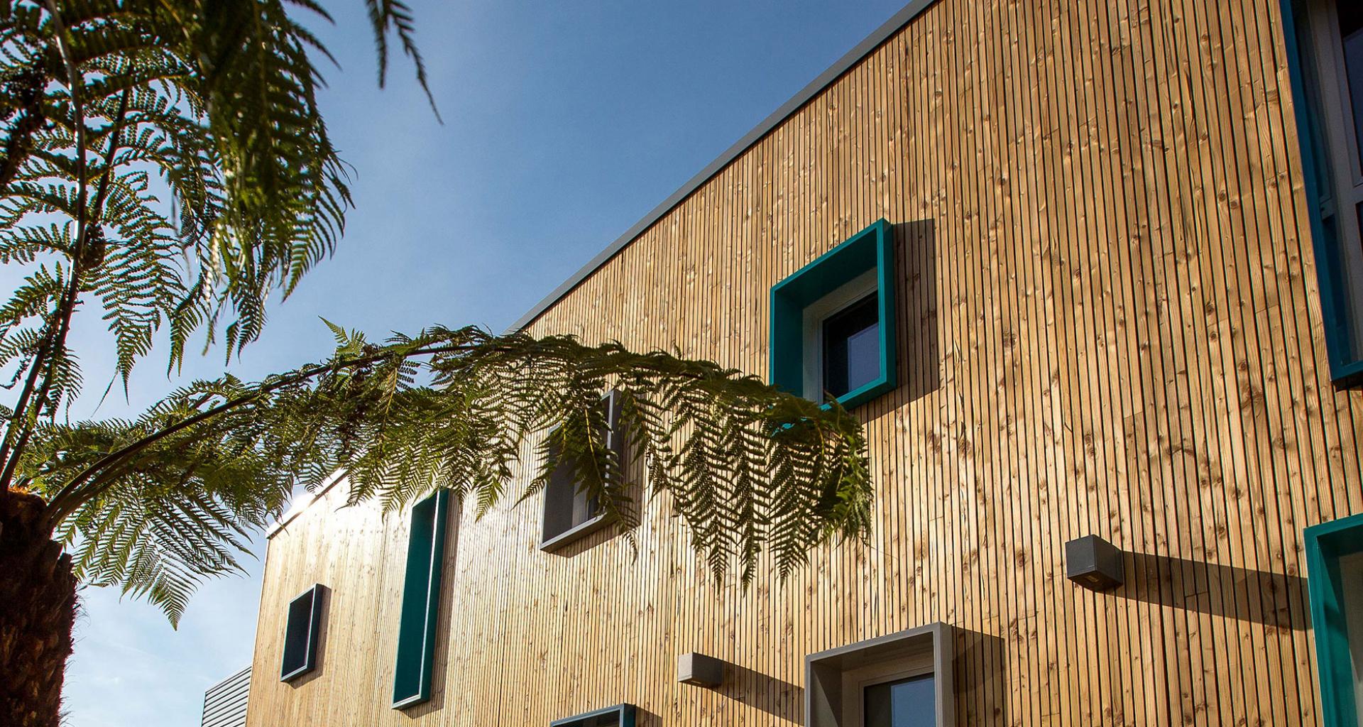 Le bardage Douglas, au profil faux claire voie, dessine de magnifiques lignes très contemporaines et met en valeur les menuiseries aux coloris vifs.